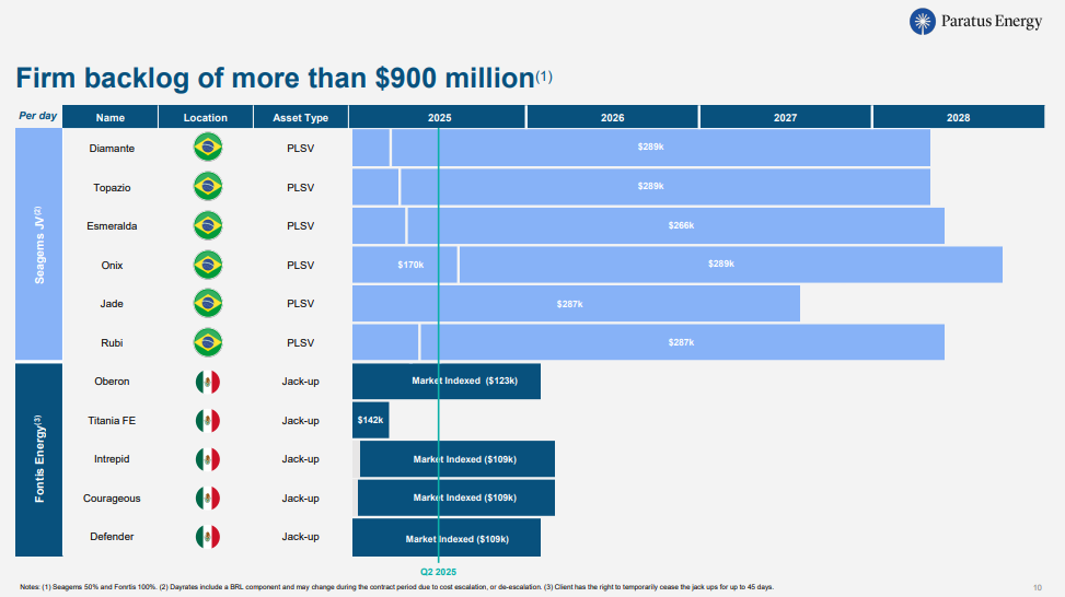 Following the jackup sale, Paratus’ remaining asset is its 50% stake in the Seagems PLSV JV, with a strong contract book through 2027–2028 in an attractive Brazilian market