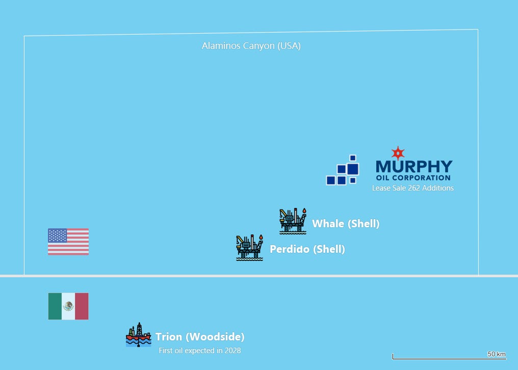 While Mexico's Gulf production is predominantly shallow, deepwater potential is emerging — Shell's Perdido and Whale developments in Alaminos Canyon and Transocean's Deepwater Thalassa, currently drilling Woodside's Trion project on the Mexican side, sit in close proximity and signal growing ultra-deepwater activity along the Perdido fold belt on both sides of the maritime boundary.
