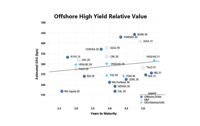 Azule Energy (B2) is a 50/50 BP/Eni JV formed in 2022 and a first-time high yield issuer as of January 2025. The ~$3.5B EBITDA E&P produces primarily from Angola's Block 15/06, neighboring ExxonMobil and TotalEnergies' production hubs, and operates PEL 85 in Namibia where its Capricornus discovery is arguably the basin's best to date. Further, Rhino reported 'excellent reservoir deliverability' at the Volans-1 well on PEL 85, advancing the discovery toward potential development although gas levels are an early concern and discoveries still require appraisal. Azule commands a spread premium given its concentrated portfolio and new issuer status, though early execution has been strong — most notably delivering the Agogo FPSO six months ahead of schedule. More to follow on Azule in the future.